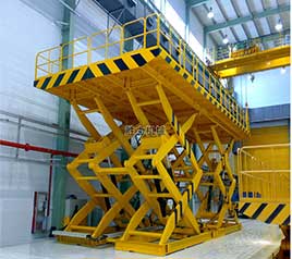 载重要求10吨,由于台面比例较大,所以我们为其设计的是双跨式设计,采用8只液压油缸顶升,保证剪叉升降机在运行时的稳定性。