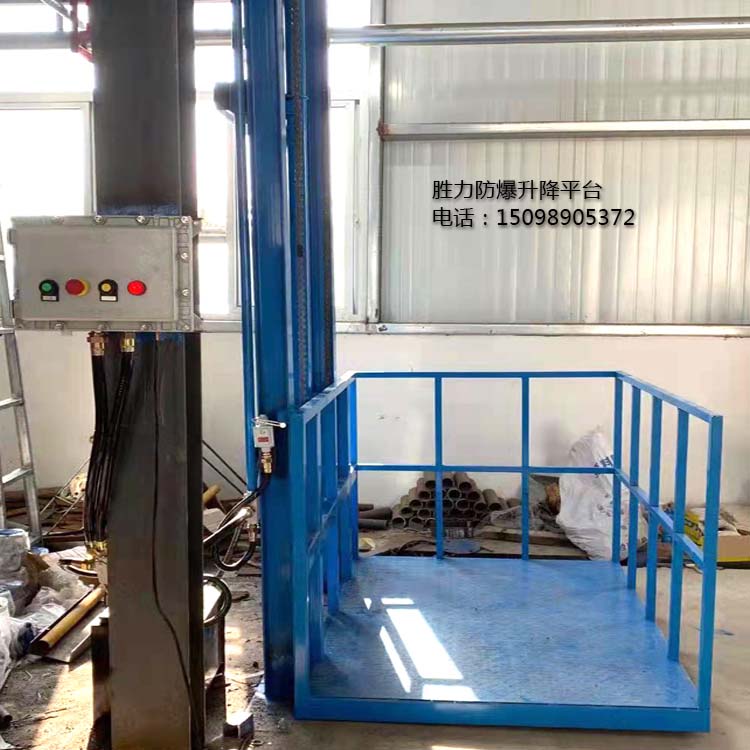 防爆升降平台是一种快速实现楼层间货物运输的简易电梯,主要结构为液压式,因此也被称为防爆液压式升降货梯,一般防爆等级为ExdIIBT4,适用于化工车间、食品厂、药厂等需要使用防爆环境的场所。胜力机械生产的防爆升降平台载重从500公斤到100吨不等,提升高度根据客户现场的实际高度进行定制。平台的大小,是否需要轿厢,轿厢材质等都可以根据客户的需求定制,满足不同客户的使用要求。