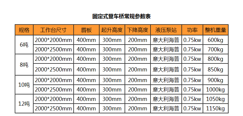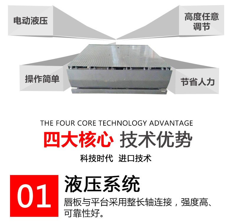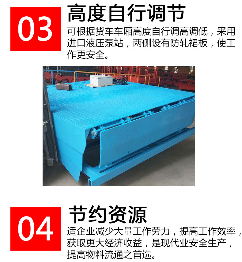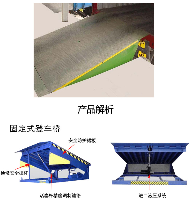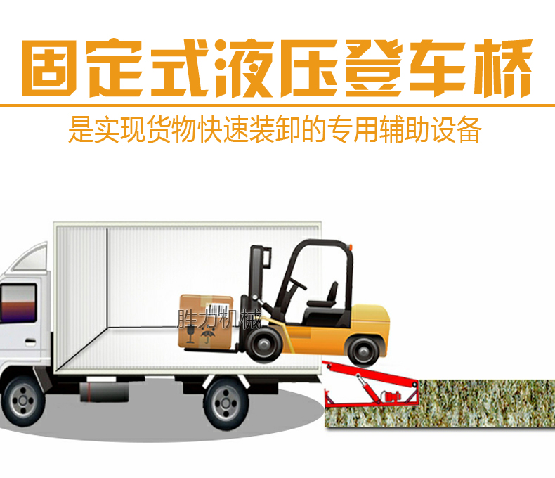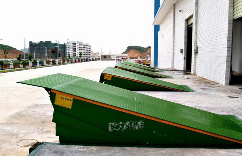 固定式登车桥是一种安装在库房月台上的装卸辅助设备,它不工作时与月台地面平齐,装卸作业时可根据货车车厢的高度进行调节登车桥的高度,使货车与仓储的货台之间架起一座桥梁,叉车等搬运车辆通过它能直接驶入货车内部进行货物的批量装卸作业,仅需单人作业,即可实现货物的快速装卸。固定式登车桥使企业减少大量劳力,提高工作效率,获取更大经济效益。