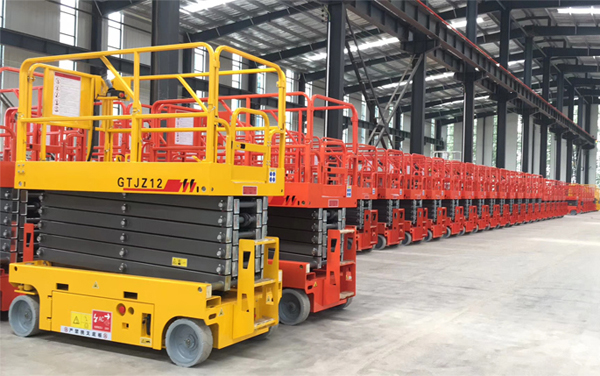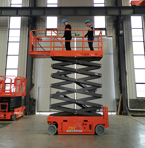 自行剪叉升降平台的剪叉机械结构, 使平台在升降过程中有着较高的稳定性,可减少工作人员在高空作业时的心里恐惧。自行剪叉升降平台的工作台面可水平延伸600mm,这样可以扩大作业范围,也可跨越一般性的障碍物进行高空作业。