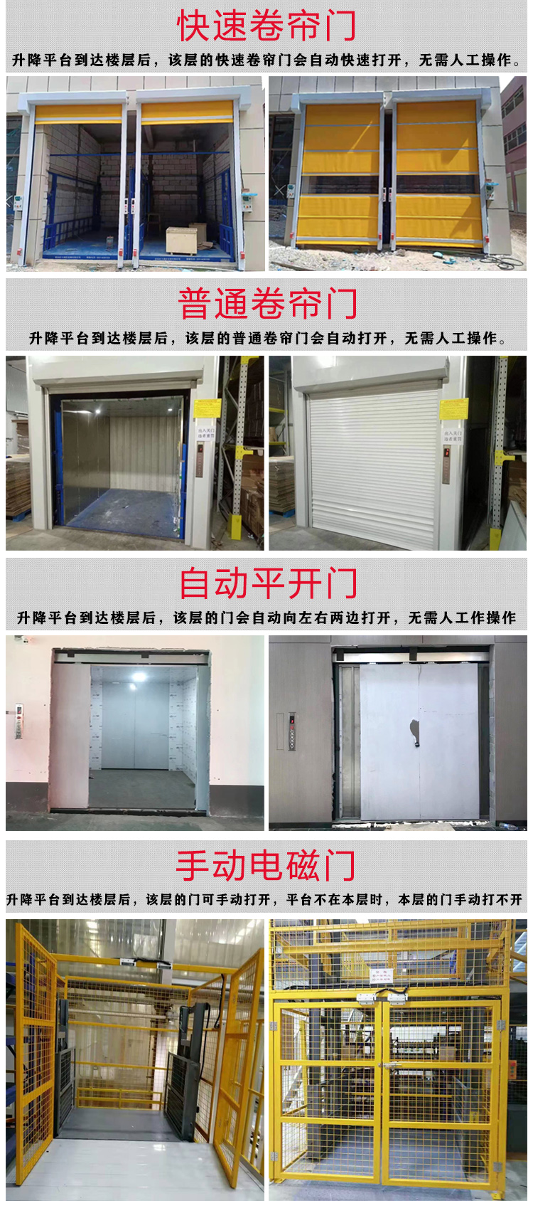 液压升降货梯设定防坠、上下层门互动,各楼层都安装数字显示操作按键。层门可全线贯通,工业厂房內外可互相戳开,便捷、节约室内空间,层门的选择有多样性。根据客户的预算和实用需求选择适合的层门即可。