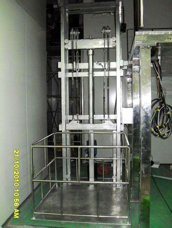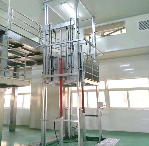 不锈钢导轨升降货梯是指导轨采用304不锈钢制作,或在整机外侧、控制柜采用304不锈钢包装。无论是以哪种结构制作,整机全部采用不锈钢材质制作或包装,通常适用于食品或制药企业,或者对洁净、耐腐蚀性要求较高的环境使用。