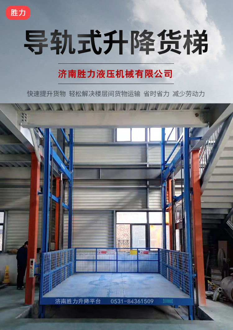 导轨式液压升降货梯是一种常见的液压升降设备,也被称为导轨链条式升降作业平台,主要由导轨、台面、链条、油缸、泵站、控制系统等组合而成。货梯的尺寸、提升高度、额定载重可以根据企业的使用需求定制生产,也可定制防爆型升降货梯。